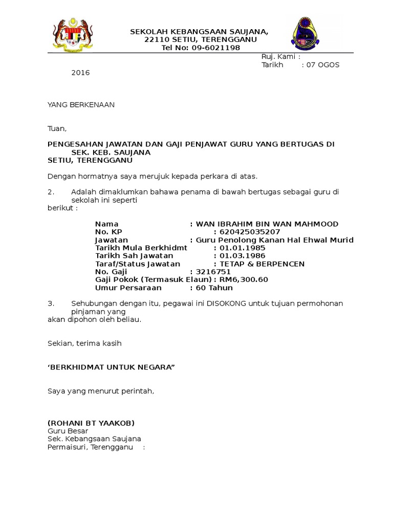 Dalam perenggan 4 perkara 3 surat. Contoh surat pengesahan jawatan guru surat pengesahan pekerja ali bin ahmad xyz sdn bhd 80200 johor bahru johor darul takzim no. Surat pengesahan dalam perkhidmatan penyata gaji borang opsyen.